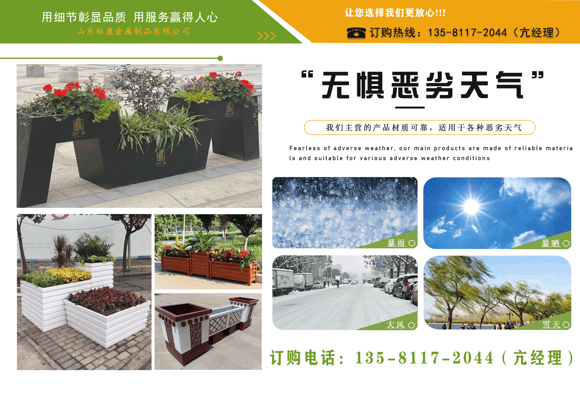 山東鈺盈金屬制品有限公司主營鍍鋅板花箱,道路隔斷花箱,定制花箱,戶外道路花箱,花箱座椅等產品,產品結構合理、性能優良,具有強度高、耐腐蝕、抗老化、隔熱隔音、節約能源、外形美觀、使用壽命長等優點,深受國內外客戶認可?! ∥覀兏鶕蛻羲诔鞘械奈幕卣?,制造出符合當地城市文化氣息的自然立體、觀賞性強的花箱產品成為城市里一道靚麗的風景線。  公司實行誠實、公正、守信、價格合理、平等互利?! 」緫{借雄厚經驗實力,恪守誠信為本的原則,得到了眾多客戶的信賴,并在業界獲得良好的口碑。建立了穩固的合作關系,隨著業務的不斷發展和壯大,合作伙伴的范圍也在不斷擴大。我們熱情盼望與您的合作,為社會的可持續發展獻上一份努力。...